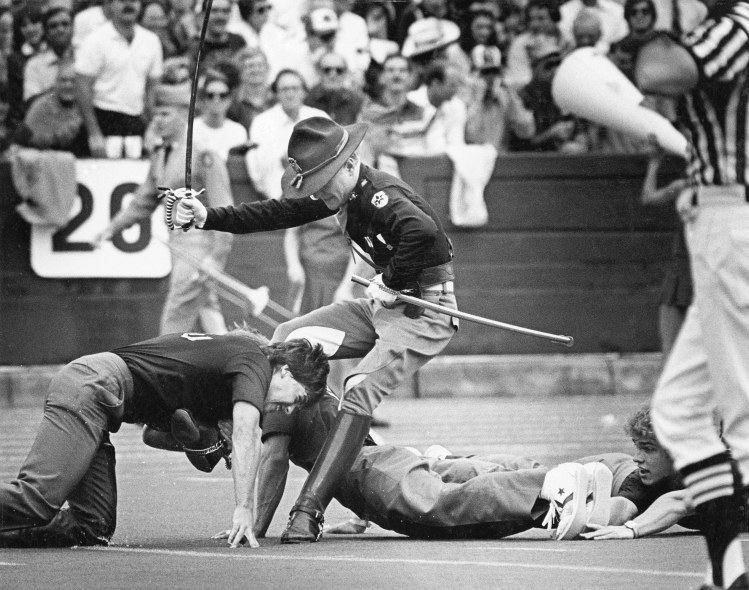 This is an oldie back from the 1981 Texas A&M University versus Southern Methodist University football game at Kyle Field in College Station, Texas. Cadet Greg Hood infamously removed his saber from its scabbard during an unauthorized incursion onto the field by SMU cheerleaders. Read more about it here from the UPI archives.