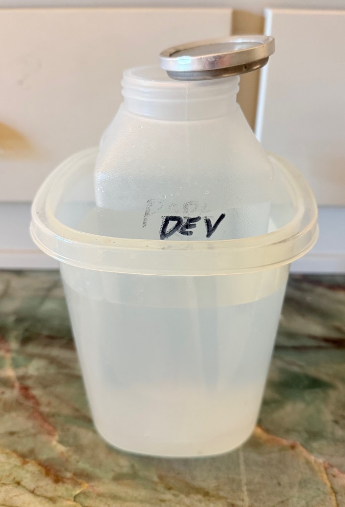 Room temperature is the “norm” for most black-and-white films, with literature calling for 68 F (20 C) as the standard. Let’s just go with that for now. There are ways to manage hotter and colder temps, but this is a good standard to go with.